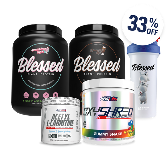This bundle is designed to be plant friendly. Blessed Vegan Protein is an all natural, vegan friendly plant protein made from sprouted pea protein isolate. While not certified vegan, OxyShred Ultra Concentration contains no animal-based ingredients but is manufactured in a facility that also processes whey protein. Acetyl L-Carnitine is a pure, pharmaceutical grade amino acid formula.